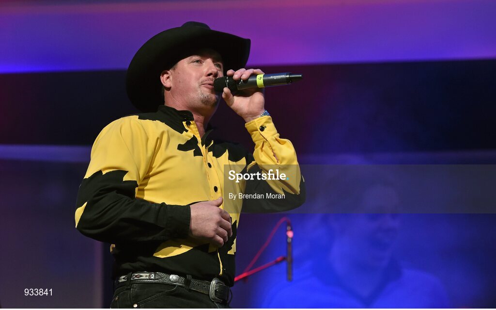 8 November 2014; Trevor Smyth, a Garth Brooks tribute act, performing during the TG4 Ladies Football All-Star Award. TG4 Ladies Football All-Star Awards 2014, Citywest Hotel, Saggart, Co. Dublin. Picture credit: Brendan Moran / SPORTSFILE