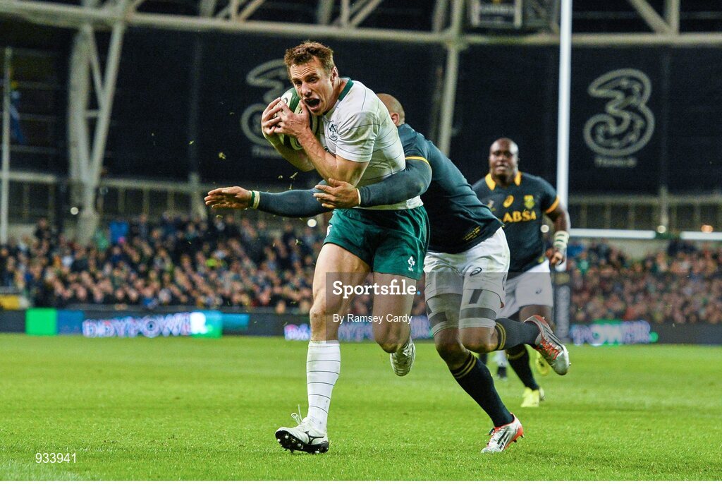 8 November 2014; Tommy Bowe, Ireland, on his way to scoring his side's second try of the game despite the tackle of Bryan Habana, South Africa. Guinness Series, Ireland v South Africa, Aviva Stadium, Lansdowne Road, Dublin. Picture credit: Ramsey Cardy / SPORTSFILE