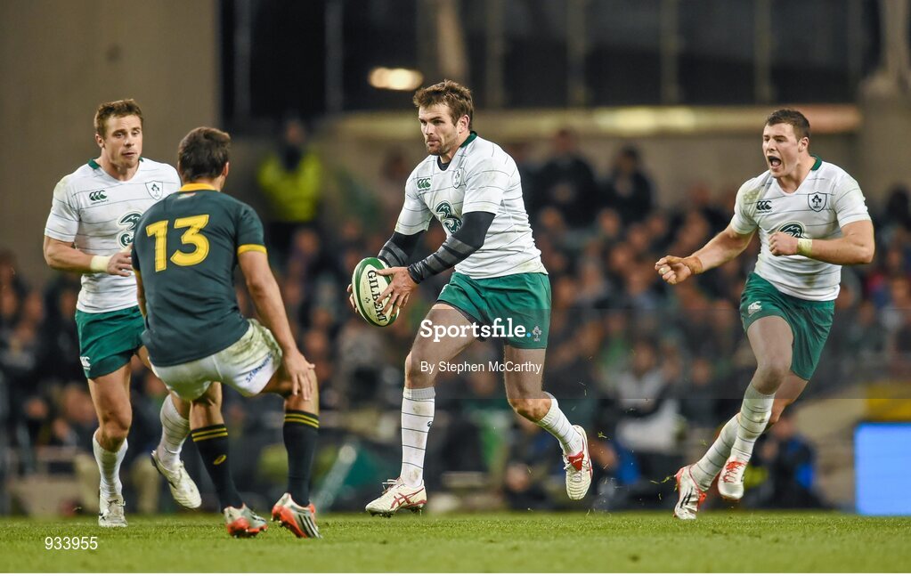 8 November 2014; Jared Payne with support from his Ireland team-mates Tommy Bowe, left, and Robbie Henshaw, right. Guinness Series, Ireland v South Africa, Aviva Stadium, Lansdowne Road, Dublin. Picture credit: Stephen McCarthy / SPORTSFILE