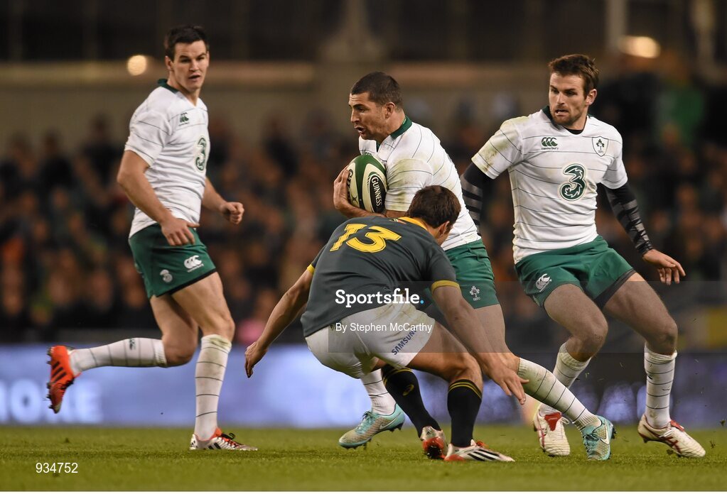 8 November 2014; Rob Kearney with support from his Ireland team-mates Jonathan Sexton, left, and Jared Payne, right, is tackled by Jan Serfontein, South Africa. Guinness Series, Ireland v South Africa, Aviva Stadium, Lansdowne Road, Dublin. Picture credit: Stephen McCarthy / SPORTSFILE