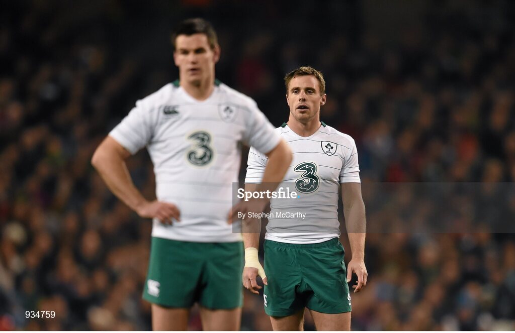8 November 2014; Tommy Bowe, right, and Jonathan Sexton, left, Ireland. Guinness Series, Ireland v South Africa, Aviva Stadium, Lansdowne Road, Dublin. Picture credit: Stephen McCarthy / SPORTSFILE