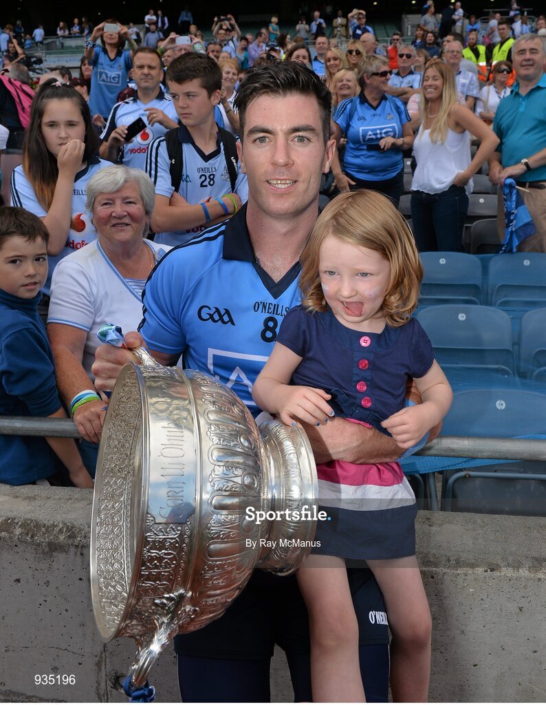 20 July 2014; Dublin's Michael Darragh Macauley with his niece Rebecca Sheridan, aged 3, from Rathfarnham, and the Delaney Cup after the game. Leinster GAA Football Senior Championship Final, Dublin v Meath, Croke Park, Dublin. Picture credit: Ray McManus / SPORTSFILE