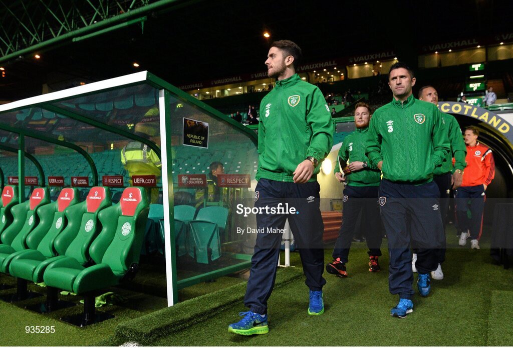 14 November 2014; Republic of Ireland's Robbie Brady, left, and Robbie Keane make their way out onto the pitch ahead of the warm up. UEFA EURO 2016 Championship Qualifier, Group D, Scotland v Republic of Ireland, Celtic Park, Glasgow, Scotland. Picture credit: David Maher / SPORTSFILE