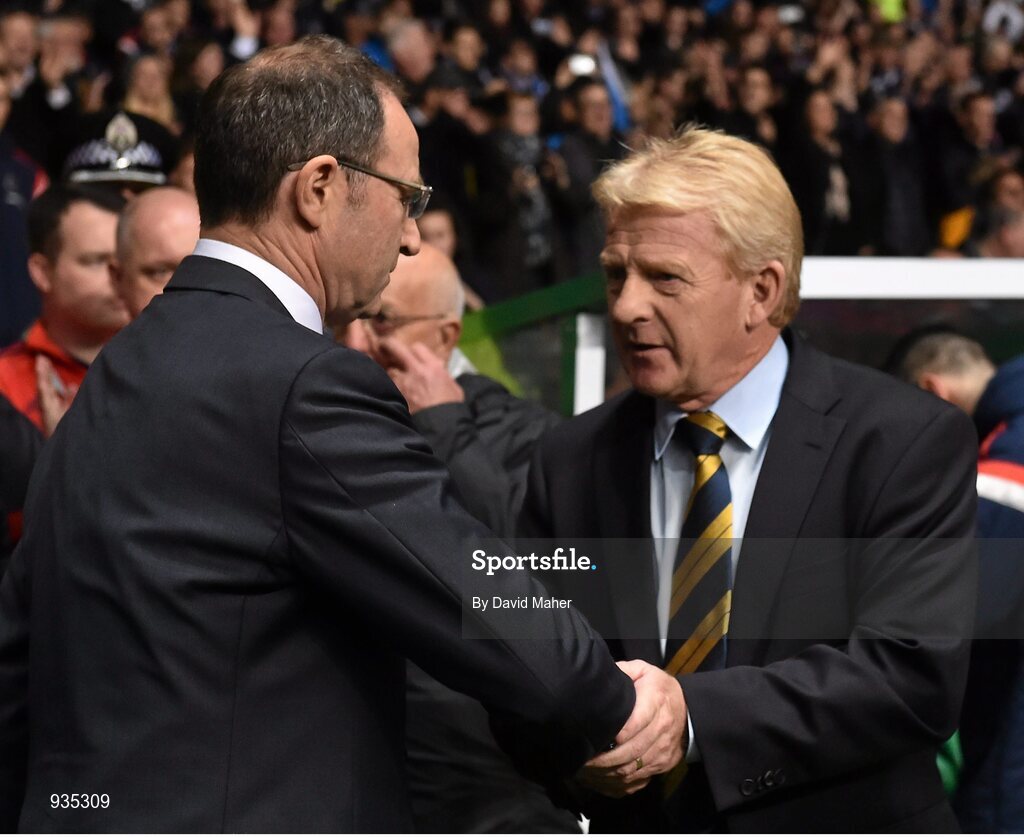 14 November 2014; Republic of Ireland manager Martin O'Neill, left, and Scotland manager Gordon Strachan before the game. UEFA EURO 2016 Championship Qualifer, Group D, Scotland v Republic of Ireland, Celtic Park, Glasgow, Scotland. Picture credit: David Maher / SPORTSFILE