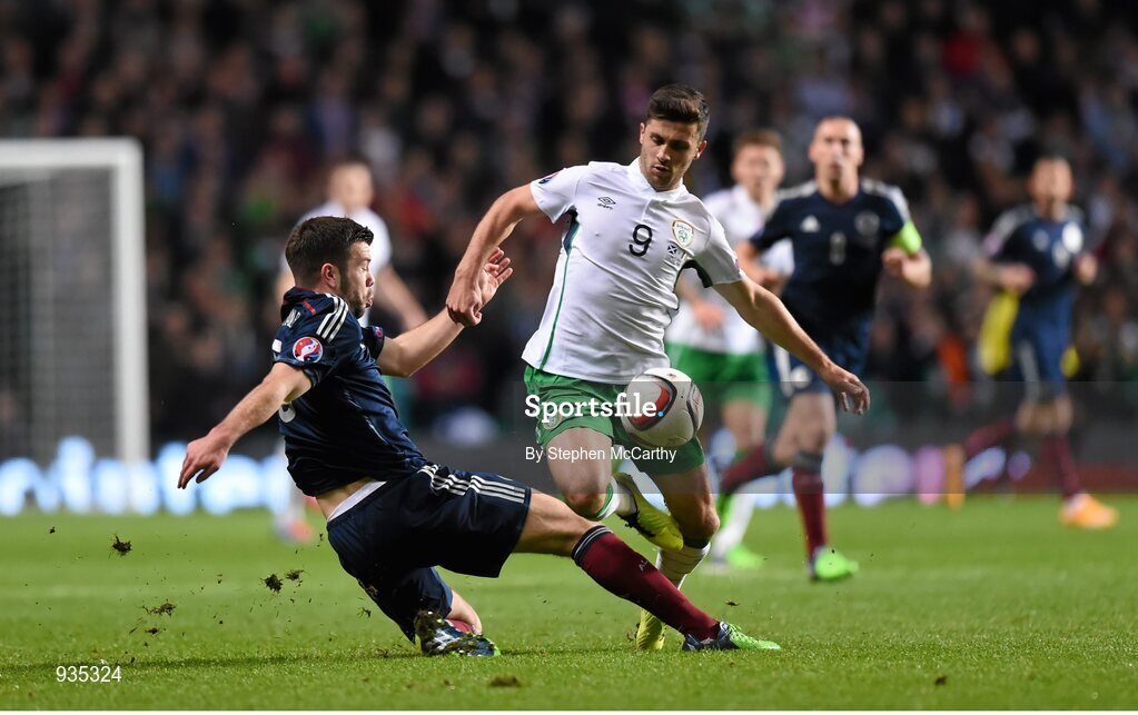 14 November 2014; Shane Long, Republic of Ireland, in action against Grant Hanley, Scotland. UEFA EURO 2016 Championship Qualifier, Group D, Scotland v Republic of Ireland, Celtic Park, Glasgow, Scotland. Picture credit: Stephen McCarthy / SPORTSFILE