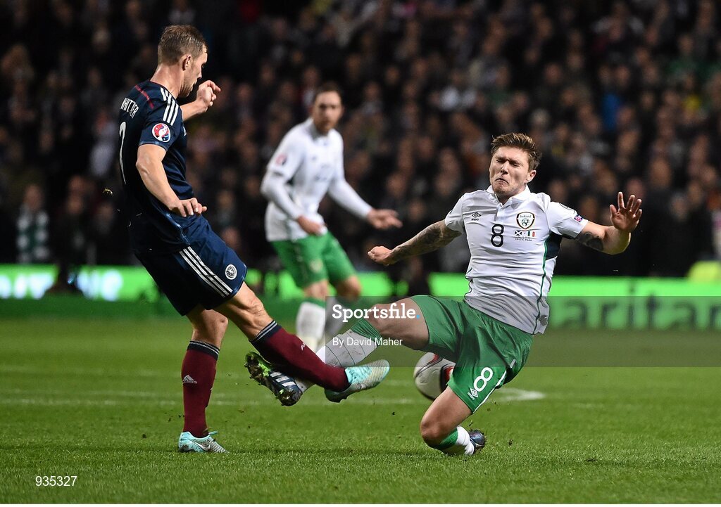 14 November 2014; Jeff Hendrick, Republic of Ireland, in action against Steven Whittaker, Scotland. UEFA EURO 2016 Championship Qualifier, Group D, Scotland v Republic of Ireland, Celtic Park, Glasgow, Scotland. Picture credit: David Maher / SPORTSFILE