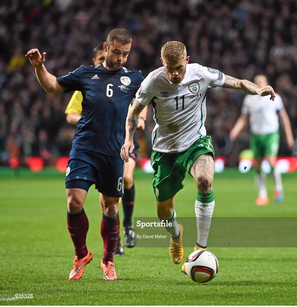 14 November 2014; James McClean, Republic of Ireland, in action against Shaun Maloney, Scotland. UEFA EURO 2016 Championship Qualifier, Group D, Scotland v Republic of Ireland, Celtic Park, Glasgow, Scotland. Picture credit: David Maher / SPORTSFILE