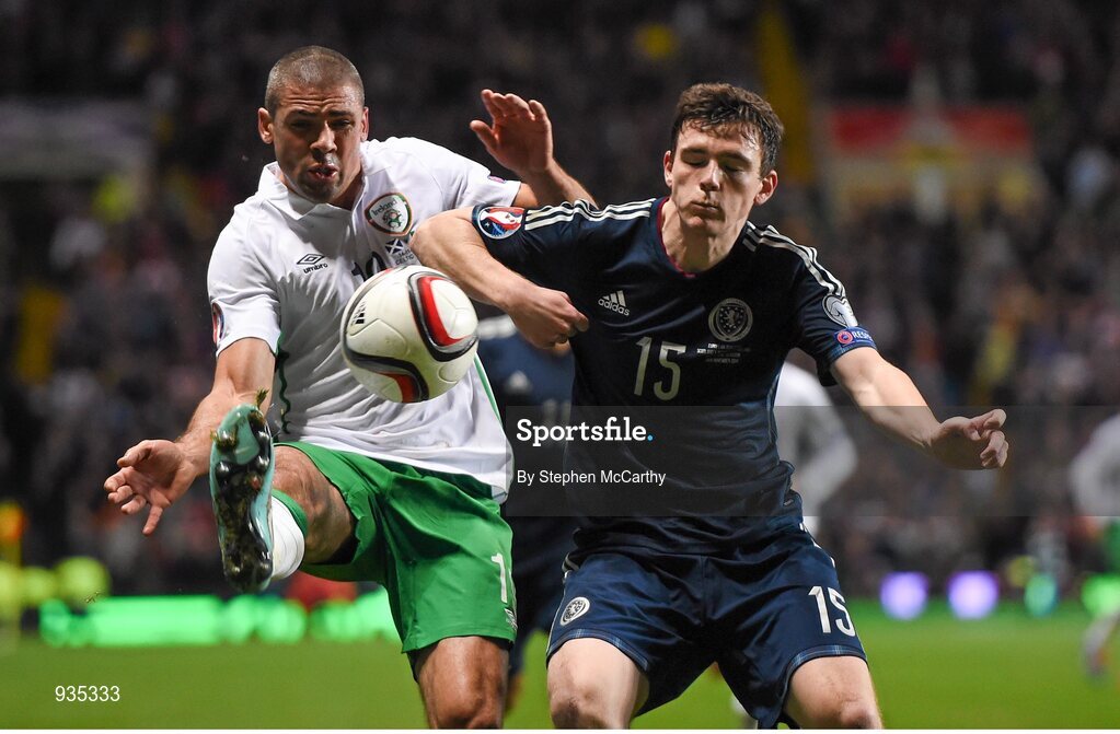 14 November 2014; Jonathan Walters, Republic of Ireland, in action against Andrew Robertson, Scotland. UEFA EURO 2016 Championship Qualifier, Group D, Scotland v Republic of Ireland, Celtic Park, Glasgow, Scotland. Picture credit: Stephen McCarthy / SPORTSFILE