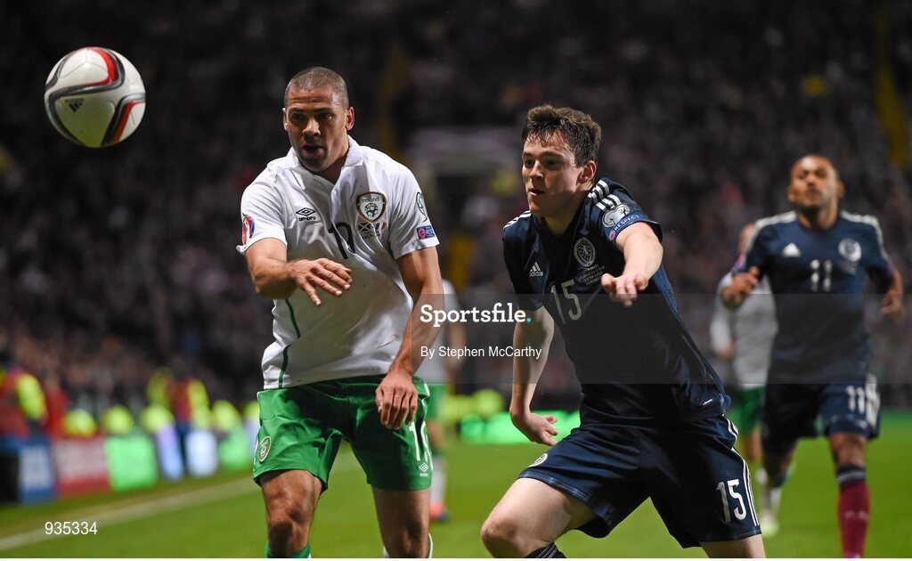 14 November 2014; Jonathan Walters, Republic of Ireland, in action against Andrew Robertson, Scotland. UEFA EURO 2016 Championship Qualifier, Group D, Scotland v Republic of Ireland, Celtic Park, Glasgow, Scotland. Picture credit: Stephen McCarthy / SPORTSFILE