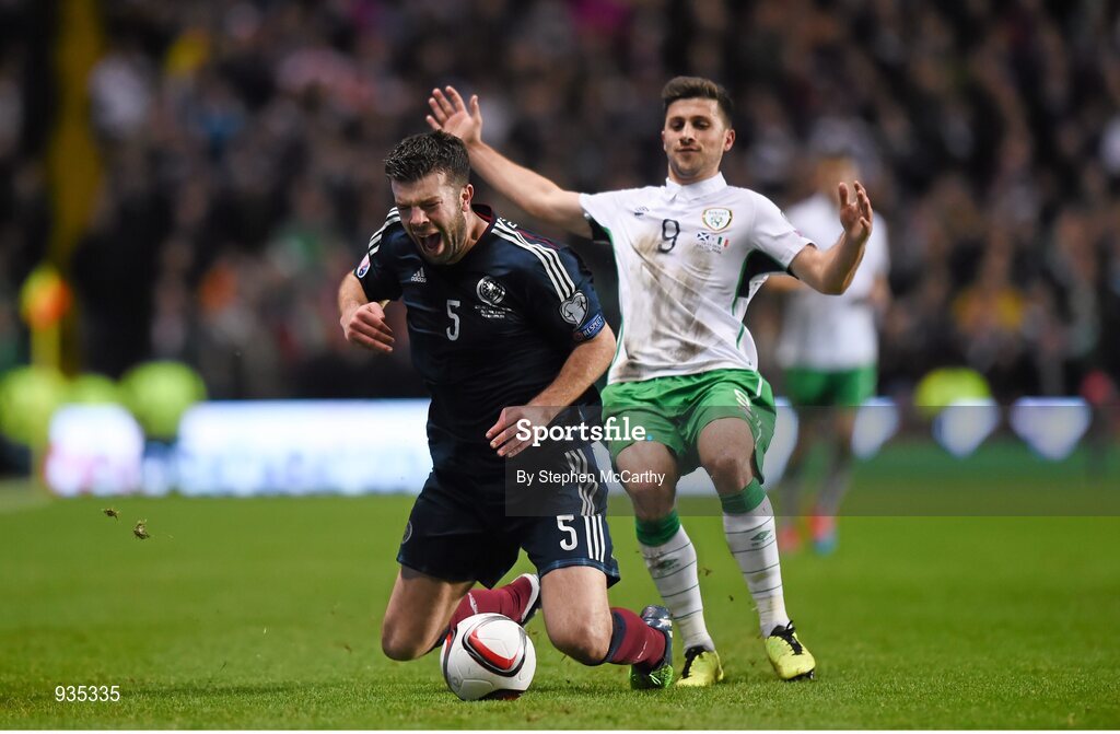14 November 2014; Grant Hanley, Scotland, in action against Shane Long, Republic of Ireland. UEFA EURO 2016 Championship Qualifier, Group D, Scotland v Republic of Ireland, Celtic Park, Glasgow, Scotland. Picture credit: Stephen McCarthy / SPORTSFILE