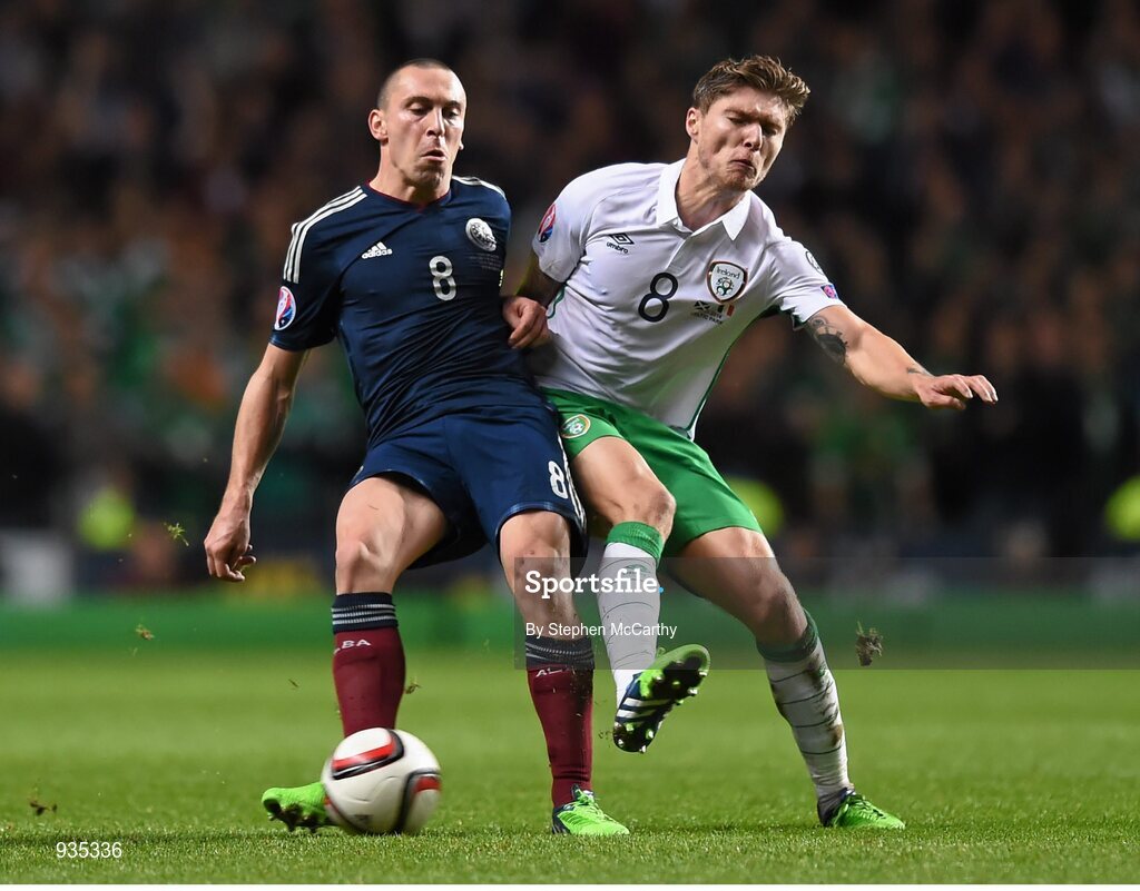 14 November 2014; Scott Brown, Scotland, in action against Jeff Hendrick, Republic of Ireland. UEFA EURO 2016 Championship Qualifier, Group D, Scotland v Republic of Ireland, Celtic Park, Glasgow, Scotland. Picture credit: Stephen McCarthy / SPORTSFILE