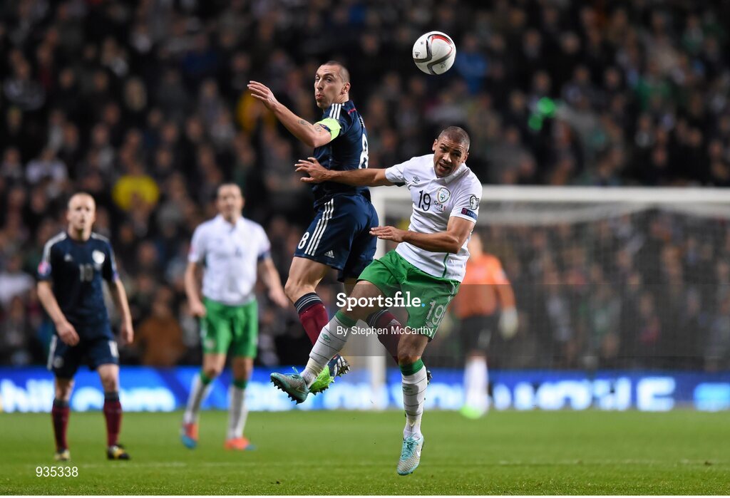 14 November 2014; Scott Brown, Scotland, in action against Jonathan Walters, Republic of Ireland. UEFA EURO 2016 Championship Qualifier, Group D, Scotland v Republic of Ireland, Celtic Park, Glasgow, Scotland. Picture credit: Stephen McCarthy / SPORTSFILE