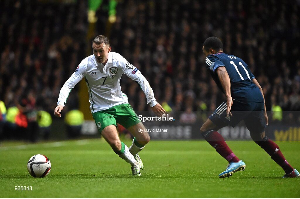 14 November 2014; Aidan McGeady, Republic of Ireland, in action against Ikechi Anya, Scotland. UEFA EURO 2016 Championship Qualifier, Group D, Scotland v Republic of Ireland, Celtic Park, Glasgow, Scotland. Picture credit: David Maher / SPORTSFILE