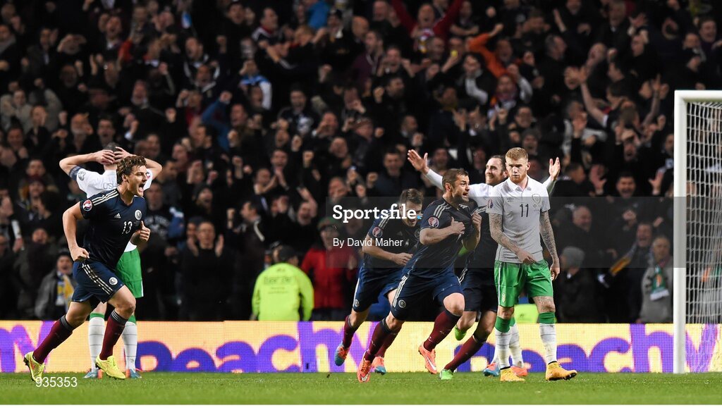 14 November 2014; Scotland's Shaun Maloney, right, celebrates after scoring his side's first goal with team-mates as Republic of Ireland players look on. UEFA EURO 2016 Championship Qualifier, Group D, Scotland v Republic of Ireland, Celtic Park, Glasgow, Scotland. Picture credit: David Maher / SPORTSFILE