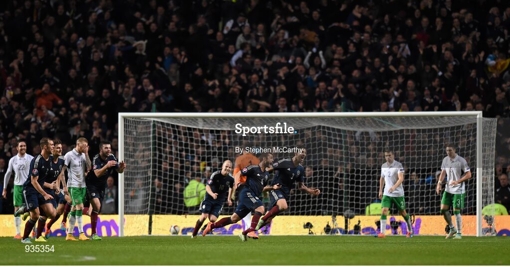 14 November 2014; Scotland's Shaun Maloney, centre, celebrates after scoring his side's first goal with team-mates as Republic of Ireland players look on. UEFA EURO 2016 Championship Qualifier, Group D, Scotland v Republic of Ireland, Celtic Park, Glasgow, Scotland. Picture credit:Stephen McCarthy / SPORTSFILE