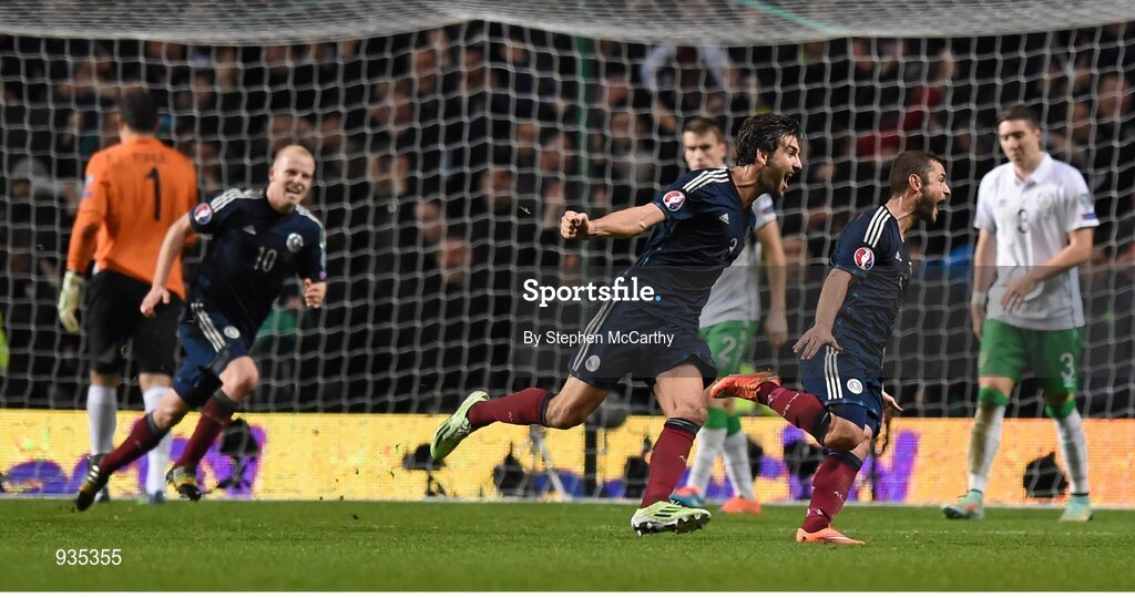 14 November 2014; Scotland's Shaun Maloney, right, celebrates after scoring his side's first goal with team-mates as Republic of Ireland players look on. UEFA EURO 2016 Championship Qualifier, Group D, Scotland v Republic of Ireland, Celtic Park, Glasgow, Scotland. Picture credit:Stephen McCarthy / SPORTSFILE