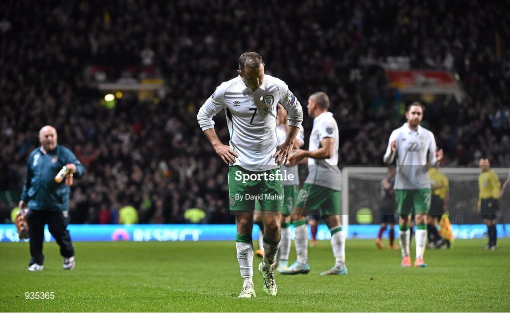 14 November 2014; A dejected Aiden McGeady, Republic of Ireland, at the end of the game. UEFA EURO 2016 Championship Qualifier, Group D, Scotland v Republic of Ireland, Celtic Park, Glasgow, Scotland. Picture credit: David Maher / SPORTSFILE