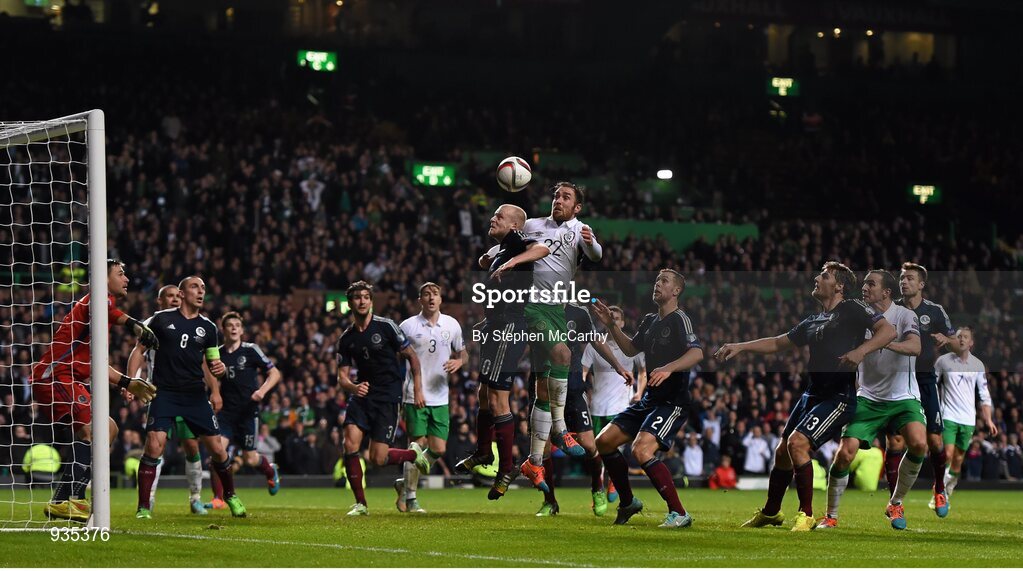 14 November 2014; Richard Keogh, Republic of Ireland, in action against Steven Naismith, Scotland. UEFA EURO 2016 Championship Qualifier, Group D, Scotland v Republic of Ireland, Celtic Park, Glasgow, Scotland. Picture credit: Stephen McCarthy / SPORTSFILE