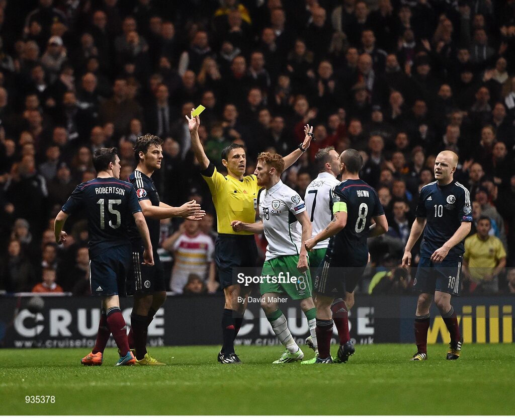14 November 2014; Stephen Quinn, Republic of Ireland, receives a yellow card from referee Milorad Mazic after players from both sides clashed during the second half. UEFA EURO 2016 Championship Qualifier, Group D, Scotland v Republic of Ireland, Celtic Park, Glasgow, Scotland. Picture credit: David Maher / SPORTSFILE