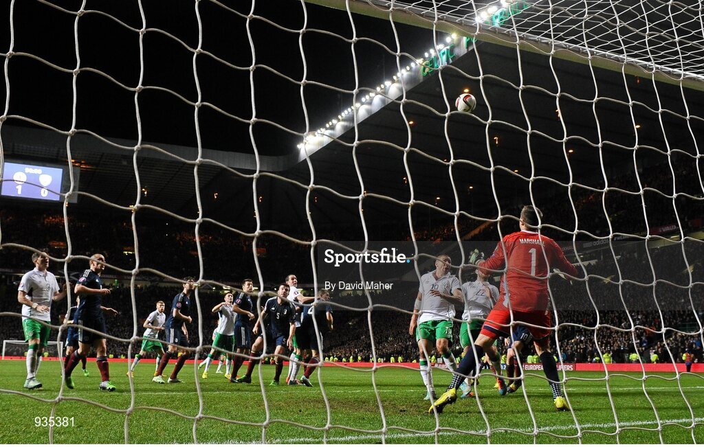 14 November 2014; Scotland's Grant Hanley's header comes off his own crossbar during the closes stages of the game. UEFA EURO 2016 Championship Qualifier, Group D, Scotland v Republic of Ireland, Celtic Park, Glasgow, Scotland. Picture credit: David Maher / SPORTSFILE