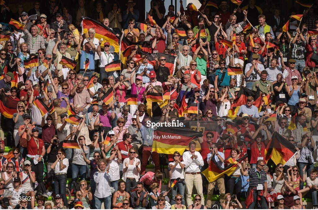 2 September 2014; German fans stand in support during the Eventing Cross-Country Team Classification. 2014 Alltech FEI World Equestrian Games, Caen, France. Picture credit: Ray McManus / SPORTSFILE