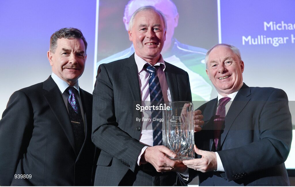 26 November 2014; Michael Lane, receives the Outstanding Coach of the Year award from Ciaran O'Cathain, President of Athletics Ireland, left, and Minister of State for Tourism and Sport Michael Ring T.D, at the National Athletics Awards. Crowne Plaza Hotel, Santry, Co. Dublin. Picture credit: Barry Cregg / SPORTSFILE