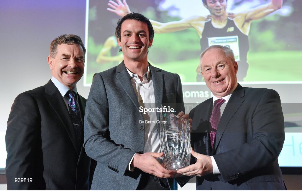 26 November 2014; Thomas Barr receives the Inspirational Perfomance on Irish Soil award from Ciaran O'Cathain, President of Athletics Ireland, left, and Minister of State for Tourism and Sport Michael Ring T.D, at the National Athletics Awards. Crowne Plaza Hotel, Santry, Co. Dublin. Picture credit: Barry Cregg / SPORTSFILE
