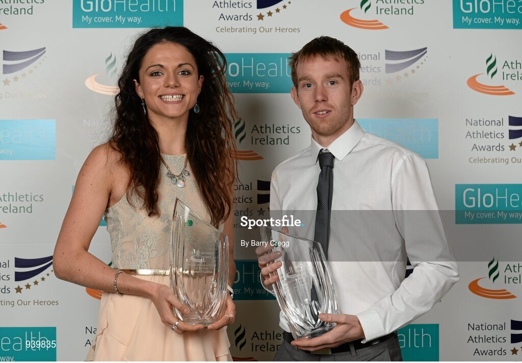 26 November 2014; Maria O'Sullivan, Trinity College Dublin, and John Travers, Athlone IT, with their University Athlete of the Year awards during the National Athletics Awards. Crowne Plaza Hotel, Santry, Co. Dublin. Picture credit: Barry Cregg / SPORTSFILE
