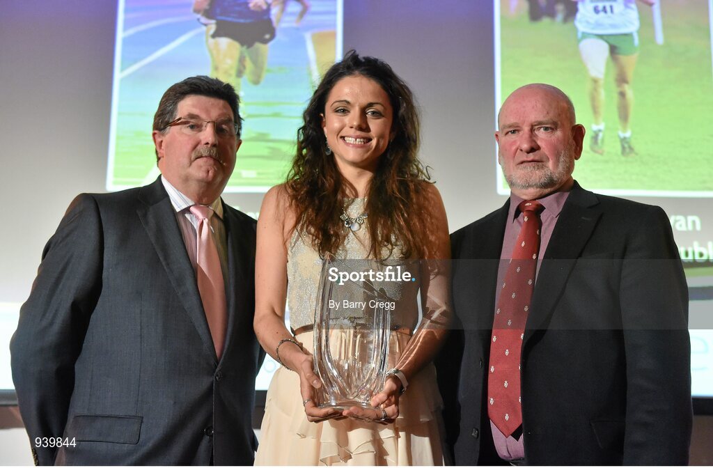 26 November 2014; Maria O'Sullivan, Trinity College Dublin, receives the Female University Athlete of the Year award from John Foley, CEO of Athletics Ireland, left, and Cyril Smyth, during the National Athletics Awards. Crowne Plaza Hotel, Santry, Co. Dublin. Picture credit: Barry Cregg / SPORTSFILE