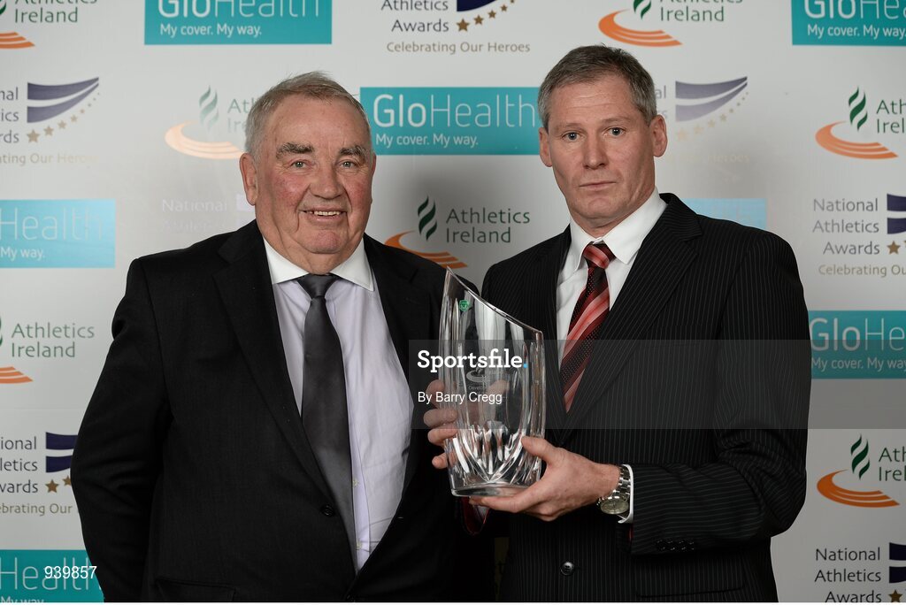 26 November 2014; Michael Cornyn, right, Chairman of Dunboyne AC, holds the Development Club of the Year award alongside former chairman Noel Leonard during the National Athletics Awards. Crowne Plaza Hotel, Santry, Co. Dublin. Picture credit: Barry Cregg / SPORTSFILE