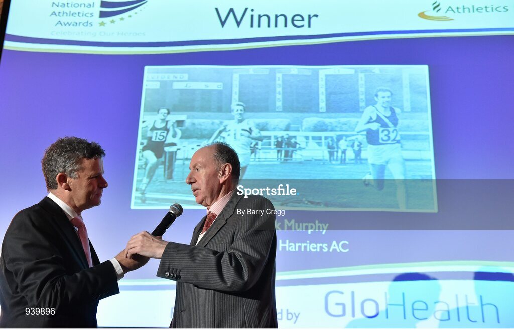 26 November 2014; Frank Murphy winner of the Hall of Fame award speaking to MC Greg Allen during the National Athletics Awards. Crowne Plaza Hotel, Santry, Co. Dublin. Picture credit: Barry Cregg / SPORTSFILE