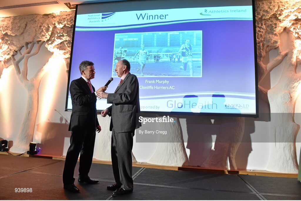 26 November 2014; Frank Murphy winner of the Hall of Fame award speaking to MC Greg Allen during the National Athletics Awards. Crowne Plaza Hotel, Santry, Co. Dublin. Picture credit: Barry Cregg / SPORTSFILE