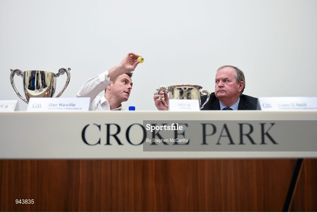 10 December 2014; Ger Keville, Sports Editor of Independent.ie, and Uachtarán Chumann Lúthchleas Gael Liam Ó Néill in attendance at the draws for the Independent.ie Higher Education GAA Senior Championships at Croke Park, Dublin. Picture credit: Stephen McCarthy / SPORTSFILE