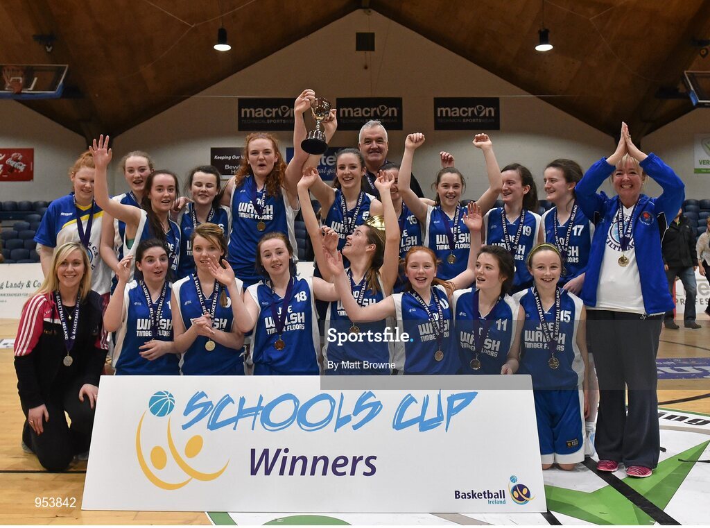 21 January 2015; St Louis Kiltimagh players celebrate with the cup. All-Ireland Schools Cup U16B Girls Final, St Louis Kiltimagh v Mercy Mounthawk. National Basketball Arena, Tallaght, Dublin. Picture credit: Matt Browne / SPORTSFILE