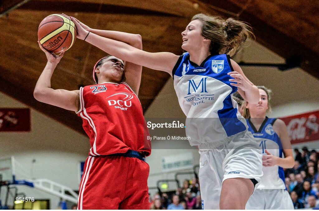 24 January 2015; Tia Kelly-Stevens, DCU Mercy, in action against Jordi Forde, Glanmire BC. Basketball Ireland Women's U18 National Cup Final, DCU Mercy v Glanmire BC, National Basketball Arena, Tallaght, Dublin. Picture credit: Piaras O Midheach / SPORTSFILE