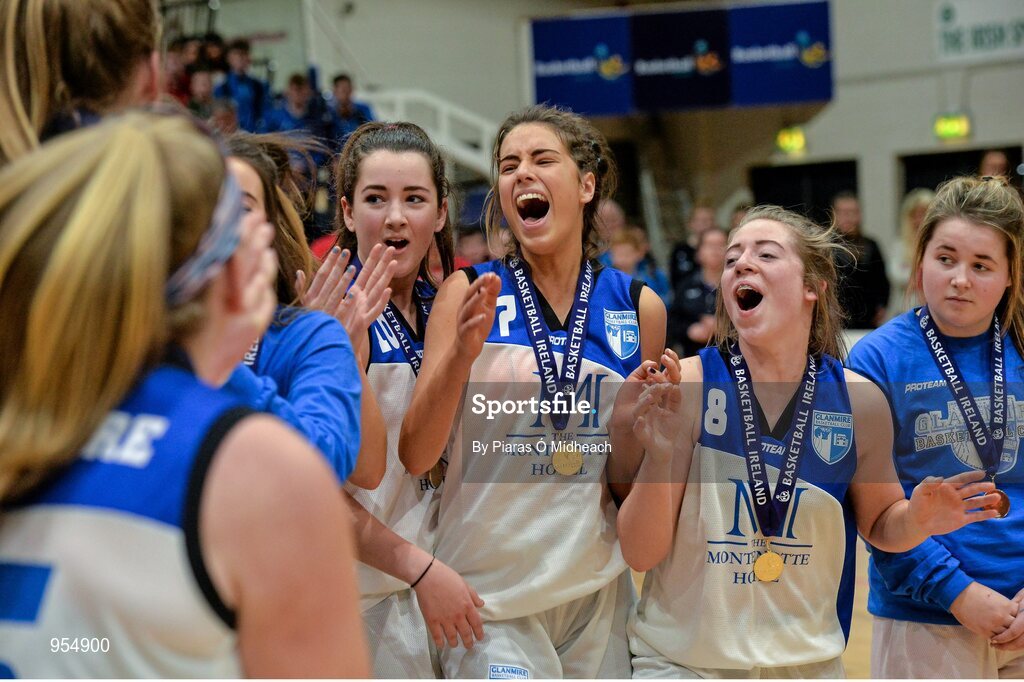 24 January 2015; Haley Lenihan, centre, Glanmire BC, celebrates with her team-mates after the game. Basketball Ireland Women's U18 National Cup Final, DCU Mercy v Glanmire BC, National Basketball Arena, Tallaght, Dublin. Picture credit: Piaras O Midheach / SPORTSFILE