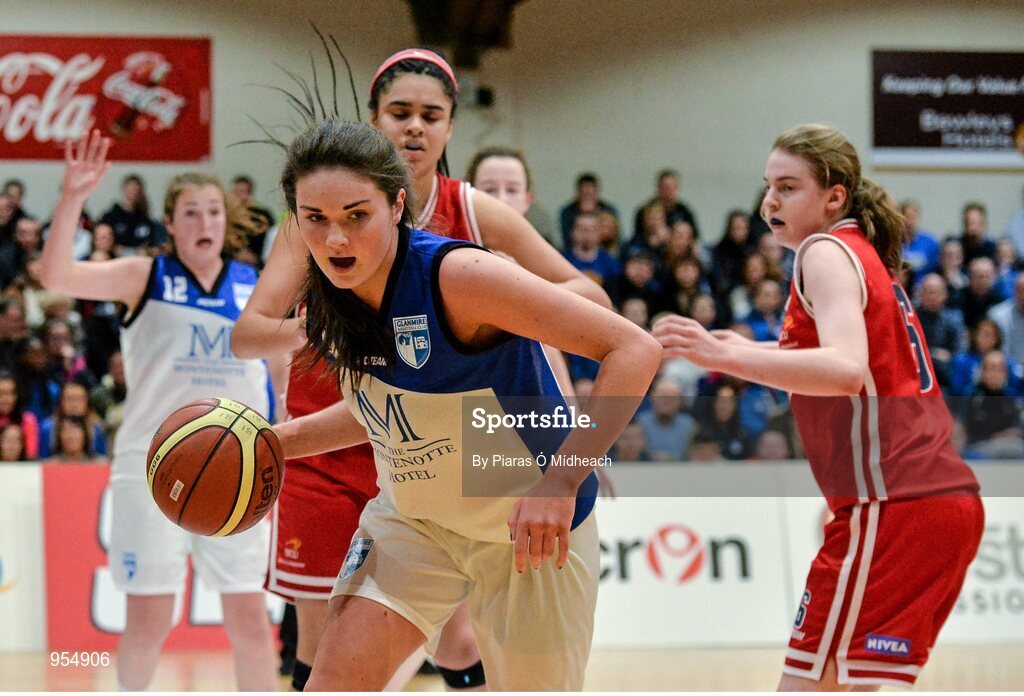 24 January 2015; Sarah Kenny, Glanmire BC, in action against Tia Kelly-Stevens, DCU Mercy. Basketball Ireland Women's U18 National Cup Final, DCU Mercy v Glanmire BC, National Basketball Arena, Tallaght, Dublin. Picture credit: Piaras O Midheach / SPORTSFILE