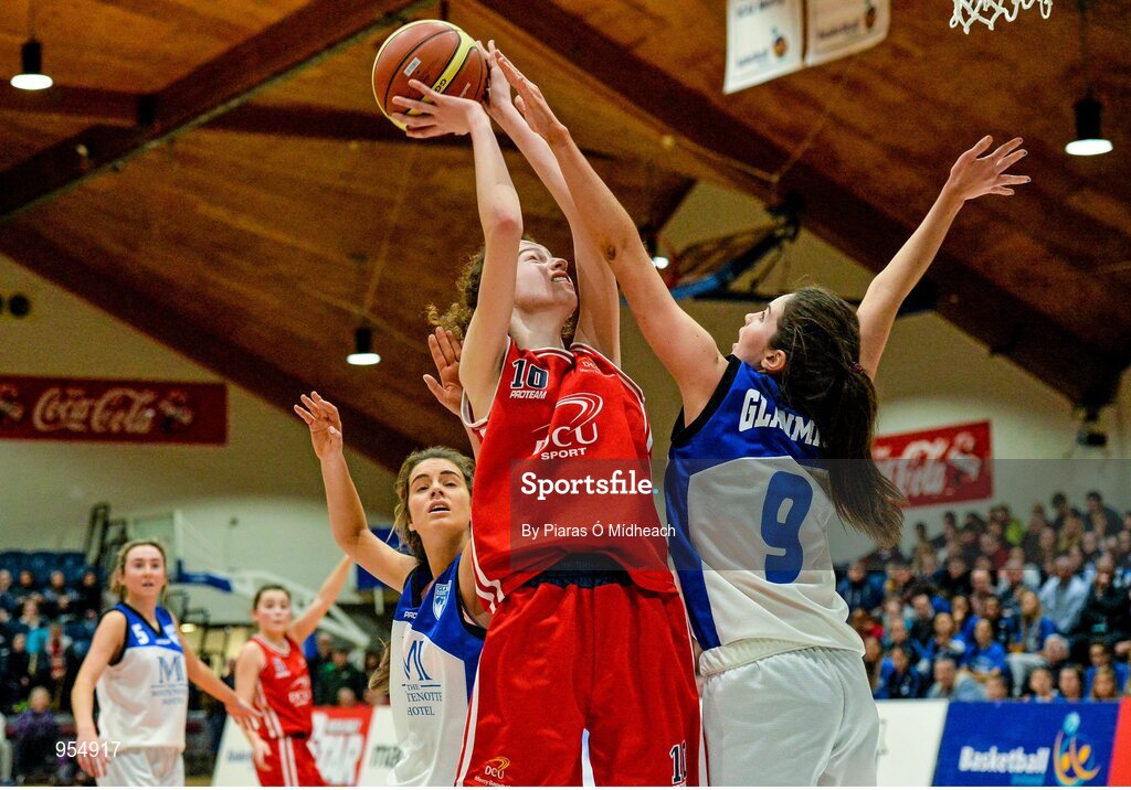 24 January 2015; Rachel Huijsdens, DCU Mercy, in action against Haley Lenihan, left, and Sarah Kenny, Glanmire BC. Basketball Ireland Women's U18 National Cup Final, DCU Mercy v Glanmire BC, National Basketball Arena, Tallaght, Dublin. Picture credit: Piaras O Midheach / SPORTSFILE