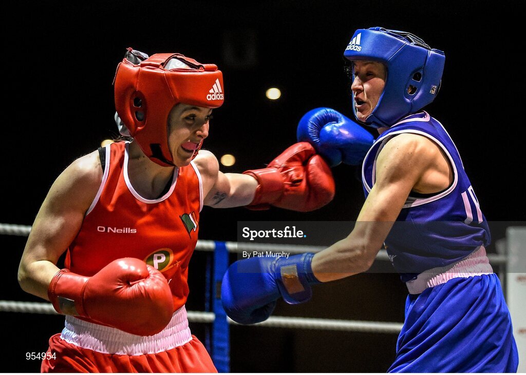 24 January 2015; Lauren Hogan, St Brigids, Co. Offaly, left, exchanges punches with Maeve Clarke, Ballinacarrow, Co. Sligo, during their 48 kg Light-flyweight bout. National Elite Boxing Championship Finals, National Stadium, Dublin. Picture credit: Pat Murphy / SPORTSFILE