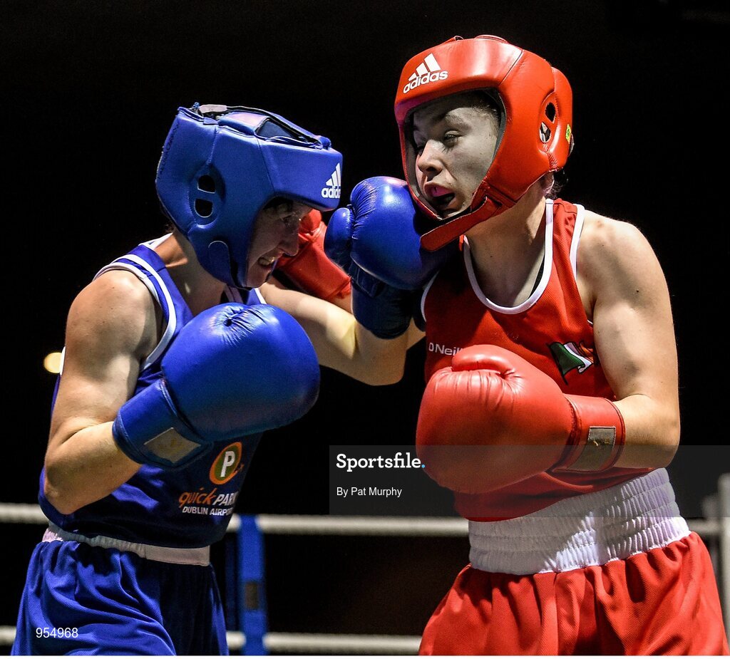 24 January 2015; Lauren Hogan, St Brigids, Co. Offaly, right, exchanges punches with Maeve Clarke, Ballinacarrow, Co. Sligo, during their 48 kg Light-flyweight bout. National Elite Boxing Championship Finals, National Stadium, Dublin. Picture credit: Pat Murphy / SPORTSFILE