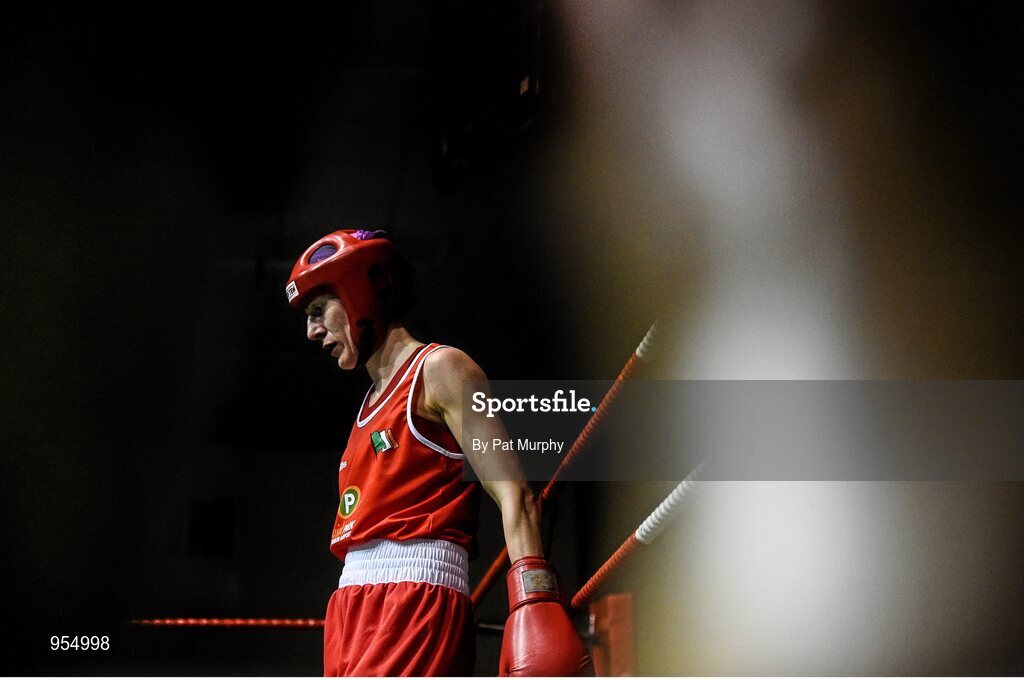 24 January 2015; Joanne Lambe, Carrickmacross, shows her disappointment after defeat in her 57 kg Featherweight bout against Dervla Duffy, St Brigids / Defence Forces, Kildare, on a 4th round knock out. National Elite Boxing Championship Finals, National Stadium, Dublin. Picture credit: Pat Murphy / SPORTSFILE