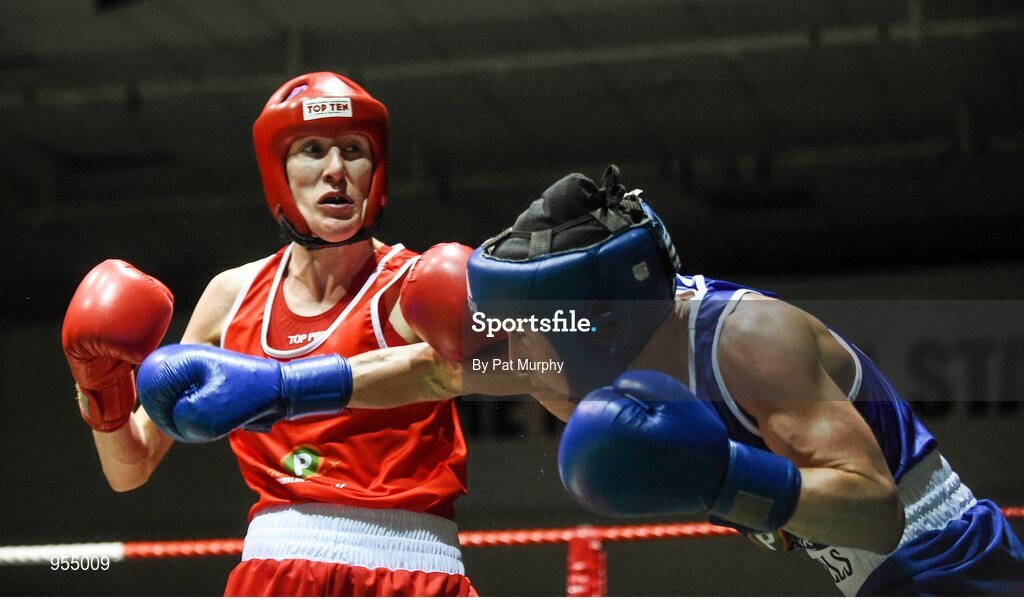 24 January 2015; Dervla Duffy, St Brigids / Defence Forces, Kildare, right, exchanges punches with Joanne Lambe, Carrickmacross, Monaghan, during their 57 kg Featherweight bout. National Elite Boxing Championship Finals, National Stadium, Dublin. Picture credit: Pat Murphy / SPORTSFILE