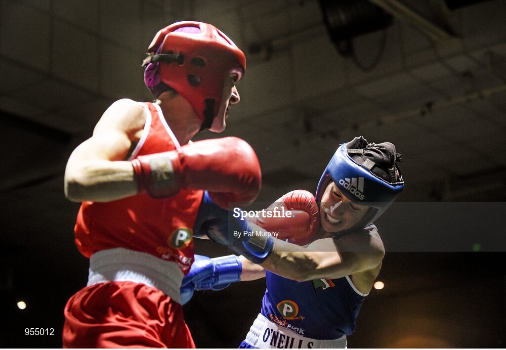 24 January 2015; Dervla Duffy, St Brigids, Kildare / Defence Forces, right, exchanges punches with Joanne Lambe, Carrickmacross, Monaghan, during their 57 kg Featherweight bout. National Elite Boxing Championship Finals, National Stadium, Dublin. Picture credit: Pat Murphy / SPORTSFILE