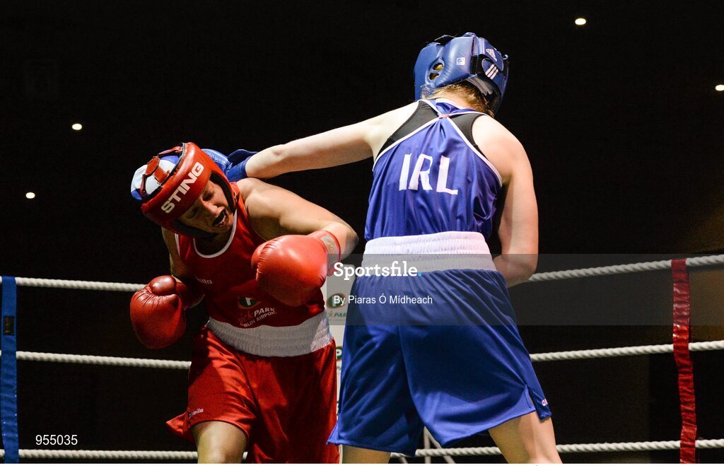24 January 2015; Louise Donohue, Geesala, right, exhanges punches with Debbie O'Reilly, Olympic, during their 60 kg bout. National Elite Boxing Championship Finals, National Stadium, Dublin. Picture credit: Piaras Ó Mídheach / SPORTSFILE