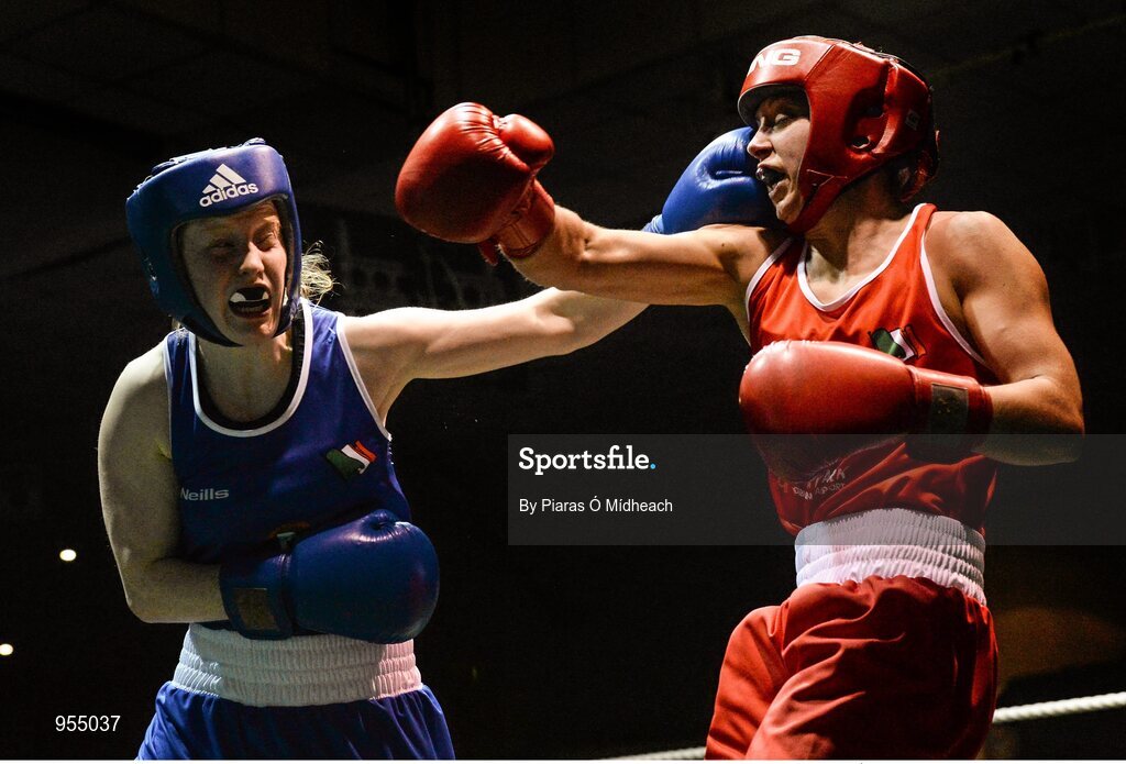 24 January 2015; Louise Donohue, Geesala, left, exhanges punches with Debbie O'Reilly, Olympic, during their 60 kg bout. National Elite Boxing Championship Finals, National Stadium, Dublin. Picture credit: Piaras Ó Mídheach / SPORTSFILE
