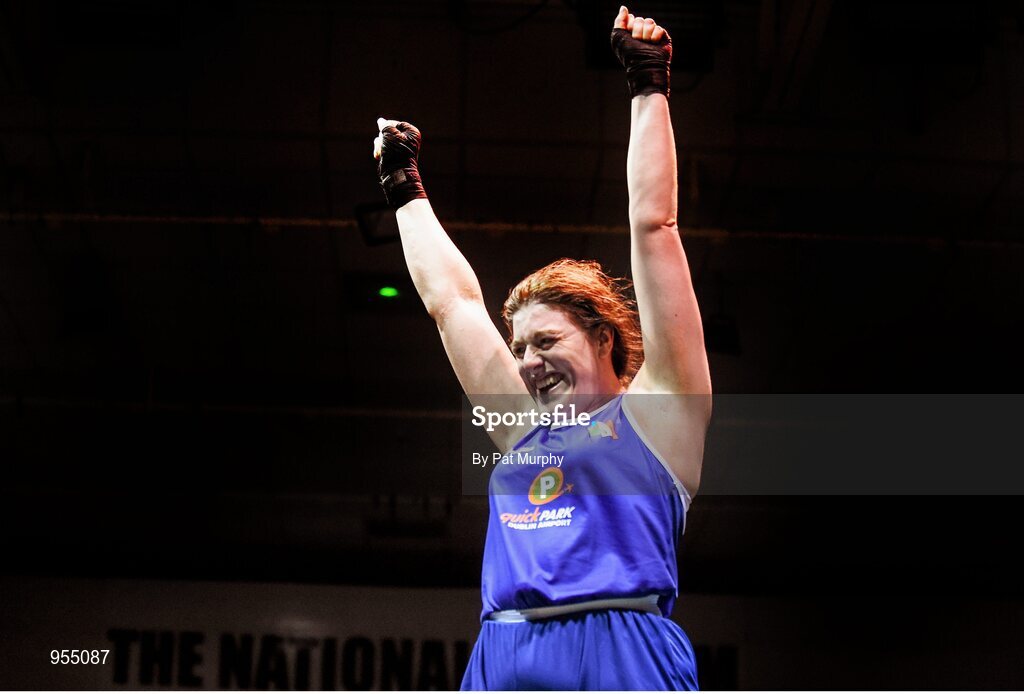 24 January 2015; Diana Campbell, Garda, celebrates after winning her 81+ kg Light-heavyweight bout against Fiona Nelson, City of Belfast. National Elite Boxing Championship Finals, National Stadium, Dublin. Picture credit: Pat Murphy / SPORTSFILE