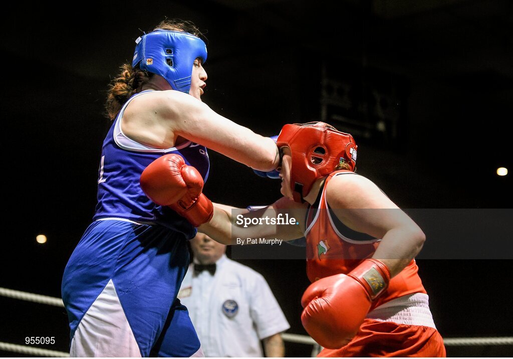 24 January 2015; Fionna Nelson, City of Belfast, right, exchanges punches with Diana Campbell, Garda, during their 81+ kg Light-heavyweight bout. National Elite Boxing Championship Finals, National Stadium, Dublin. Picture credit: Pat Murphy / SPORTSFILE