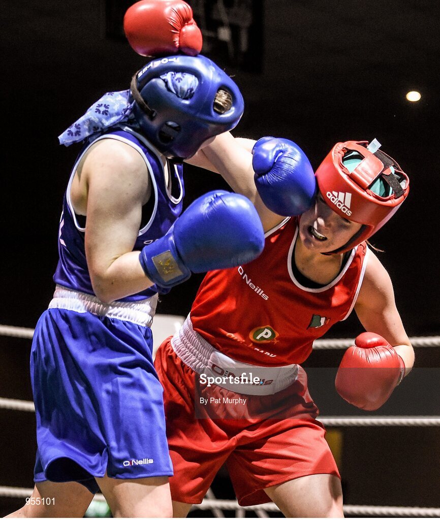 24 January 2015; Claire Grace, Callan, Kilkenny, left, exchanges punches with Christina Desmond, Macroom, Cork, during their 69 kg Welterweight bout. National Elite Boxing Championship Finals, National Stadium, Dublin. Picture credit: Pat Murphy / SPORTSFILE