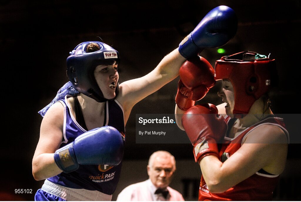 24 January 2015; Claire Grace, Callan, Kilkenny, left, exchanges punches with Christina Desmond, Macroom, Cork, during their 69 kg Welterweight bout. National Elite Boxing Championship Finals, National Stadium, Dublin. Picture credit: Pat Murphy / SPORTSFILE