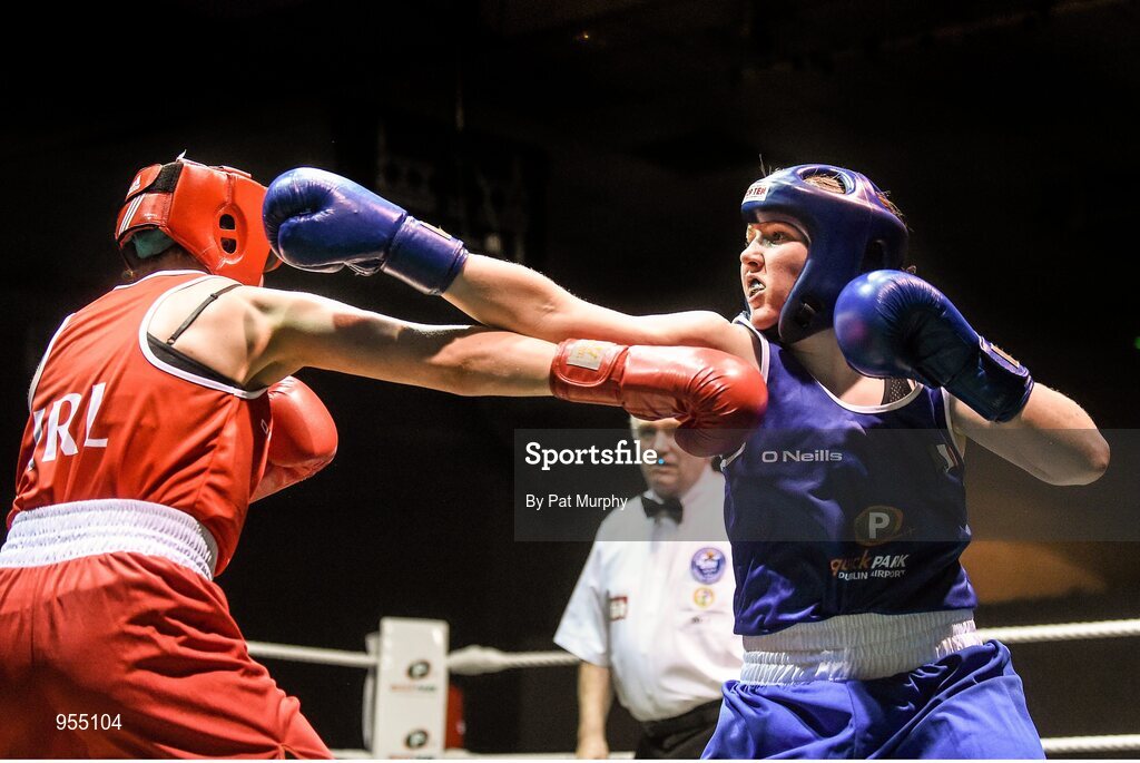 24 January 2015; Claire Grace, Callan, Kilkenny, right, exchanges punches with Christina Desmond, Macroom, Cork, during their 69 kg Welterweight bout. National Elite Boxing Championship Finals, National Stadium, Dublin. Picture credit: Pat Murphy / SPORTSFILE